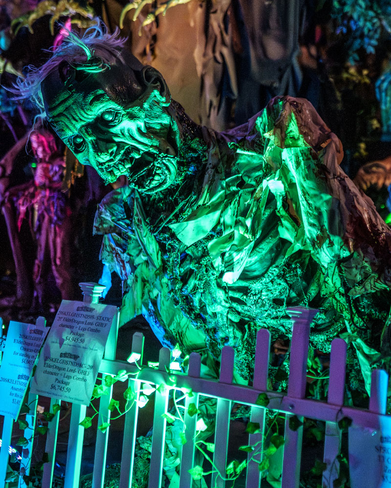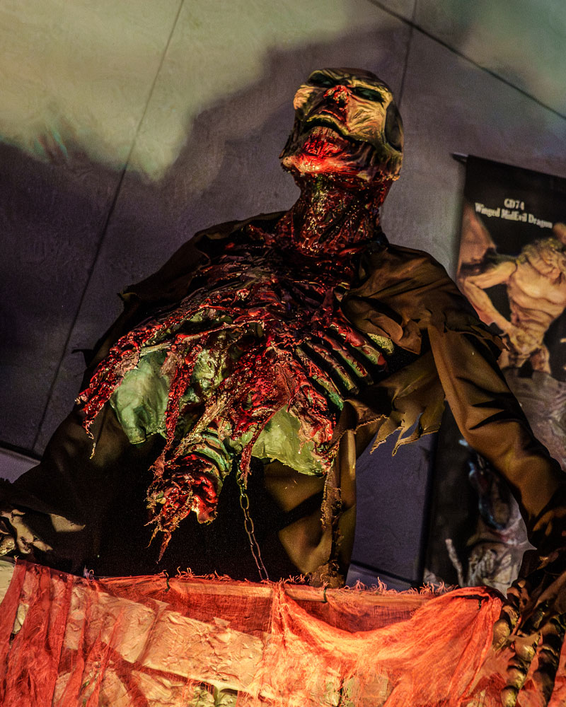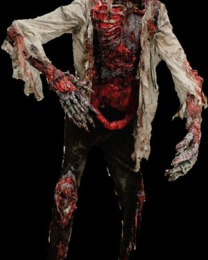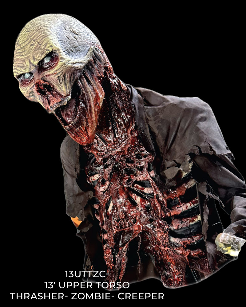 The upper torso remains of a ghoulish rotting 13’ or 20’ tall Zombies, looks down on us as he supports himself by placing both arms spread across the tops of the corner of 8’ tall walls. Upon activation, he screams to life thrashing madly pushing himself up/down, left/right, forward/back. Realistic multiple head, jaw, torso and arm movements allow the character to thrash wildly and because it is suspended by multiple hand, elbow and shoulder pivots it has incredible, natural movements.
