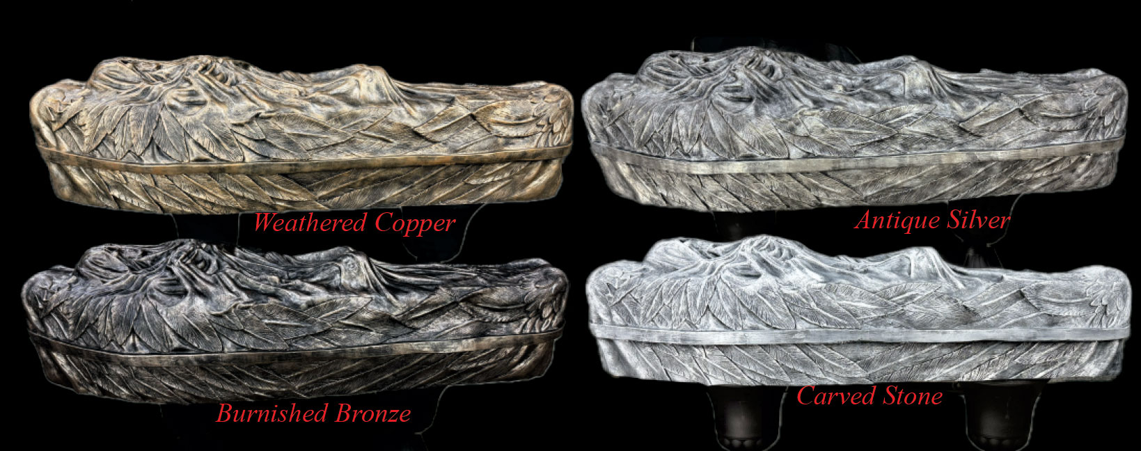 Available in a variety of Finishes to include: Burnished Bronze, Antique Silver, Weathered Copper, Carved Stone.