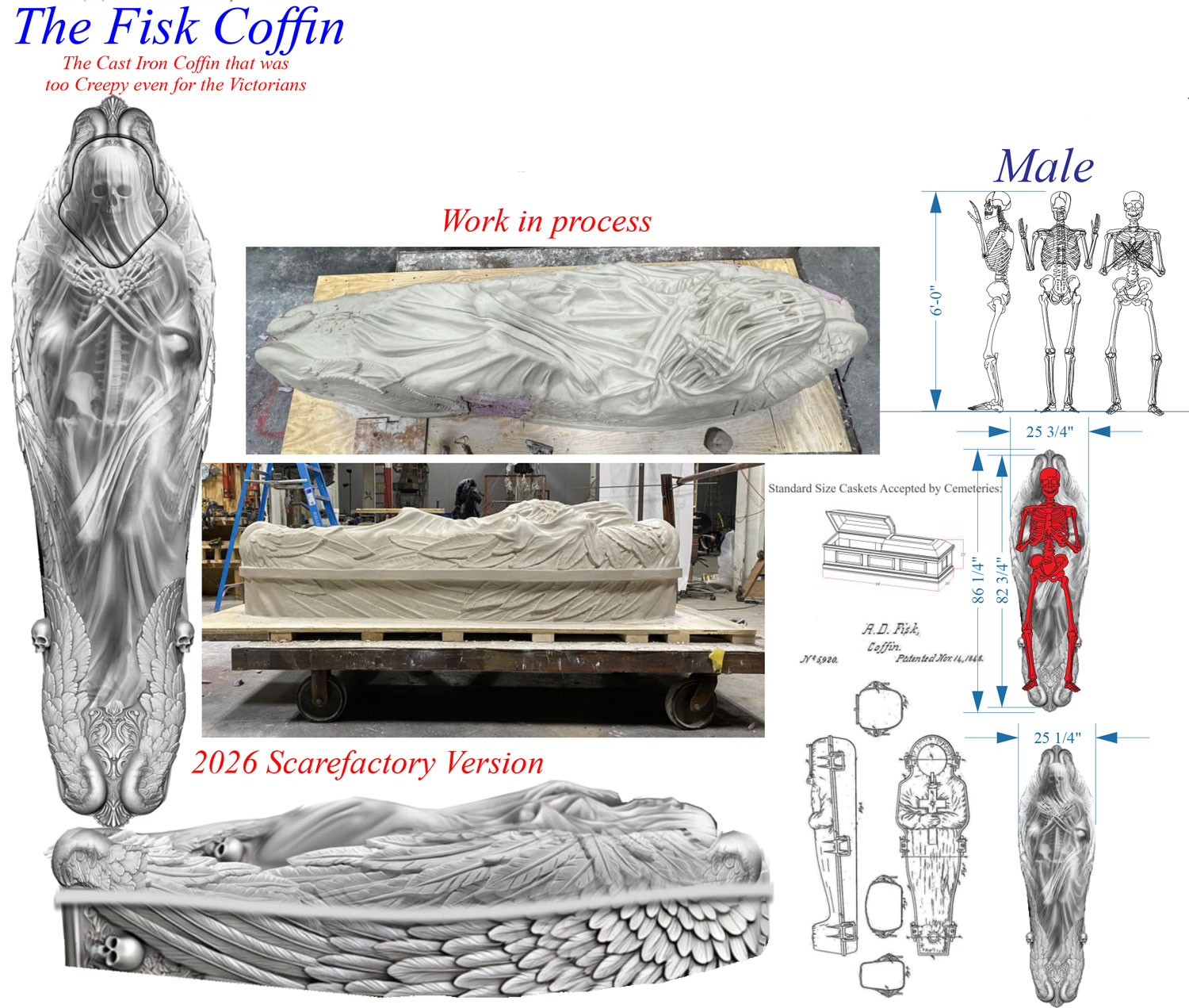 The Cast Iron Coffin that was too Creepy even for the Victorians A fantasy interpretation of a “Fisk Coffin”, incredibly detailed sculpture made out of super durable Polyurea. This is the statement piece of any gothic Victorian crypt. Available as static coffins, coffins with removable lids, as well as animated prop effects- with thrashing, screaming buried alive character trying to escape their chained cast iron tombs.