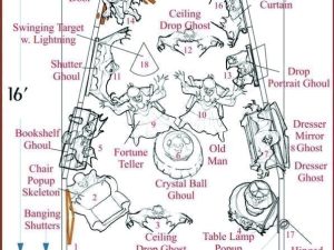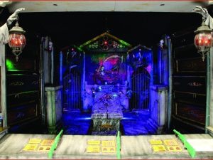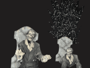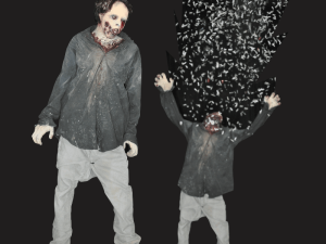 Even Zombies gotta go… Zombie sitting in outhouse with door open. When hit, zombie face plants by falling out of door, confetti cannon hidden in potty goes off, blowing the wall down as strobe lights go off.