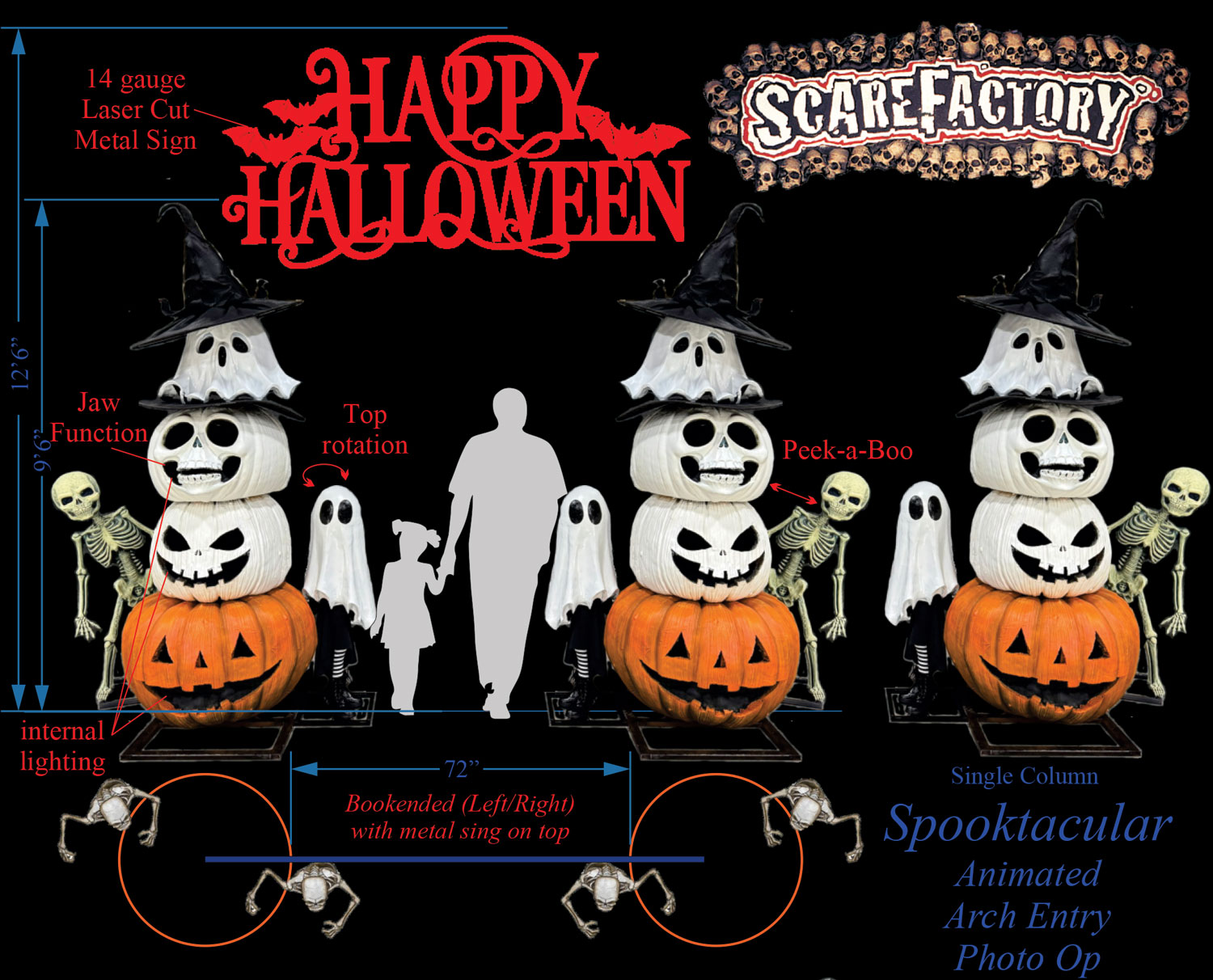 Stacked (4) characters tall this array of whimsical spooky Halloween characters creates two interconnected columns supporting a large laser cut sign between them. Guests are encouraged to walk in between and thru them, triggering the characters to come to life, speak and become animated to the delight of guests young and old.