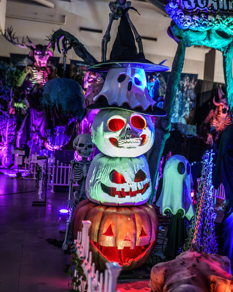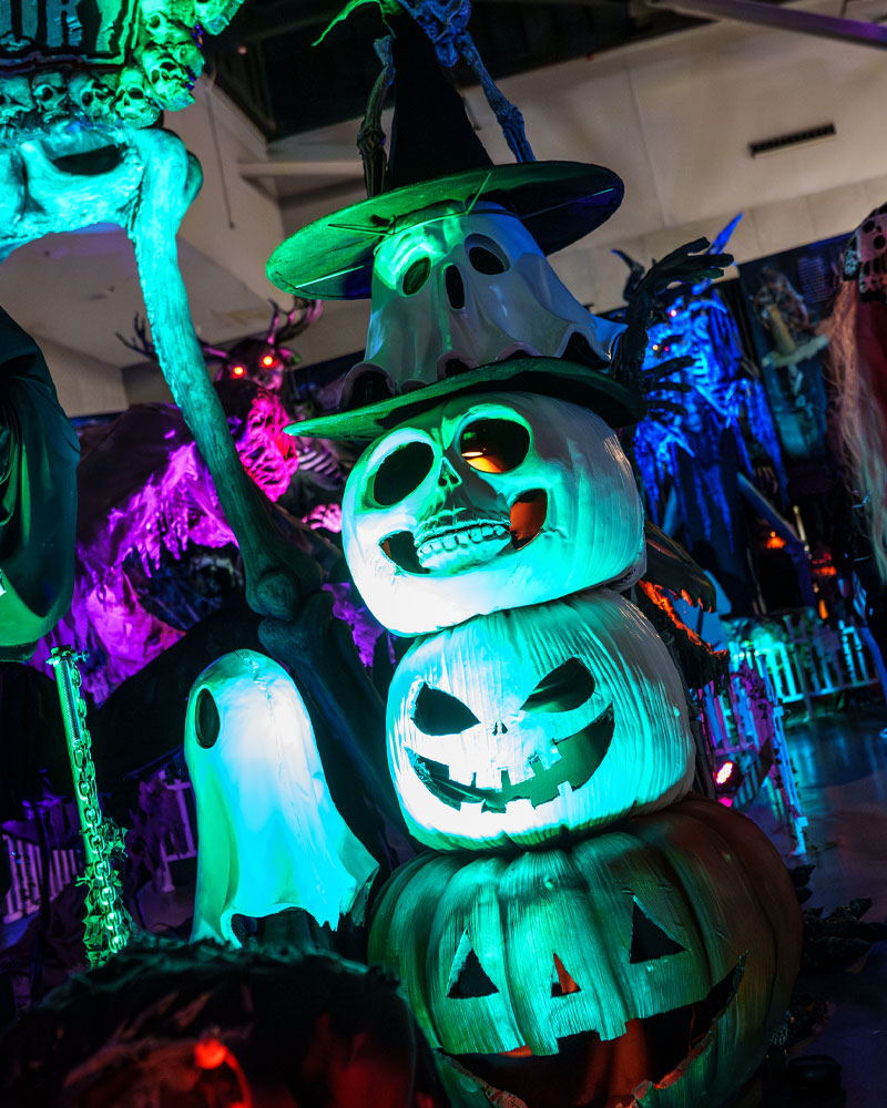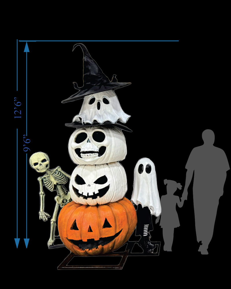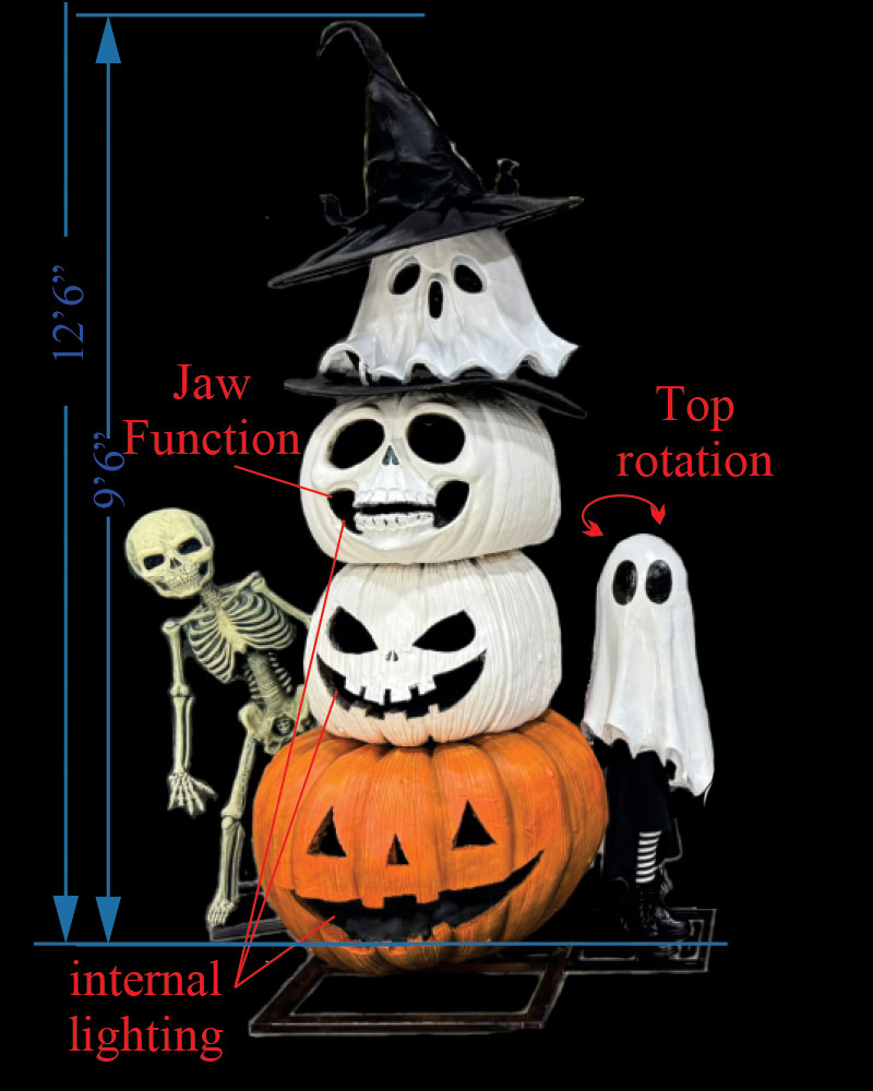 Stacked (4) characters tall this array of whimsical spooky Halloween characters creates two interconnected columns supporting a large laser cut sign between them. Guests are encouraged to walk in between and thru them, triggering the characters to come to life, speak and become animated to the delight of guests young and old.