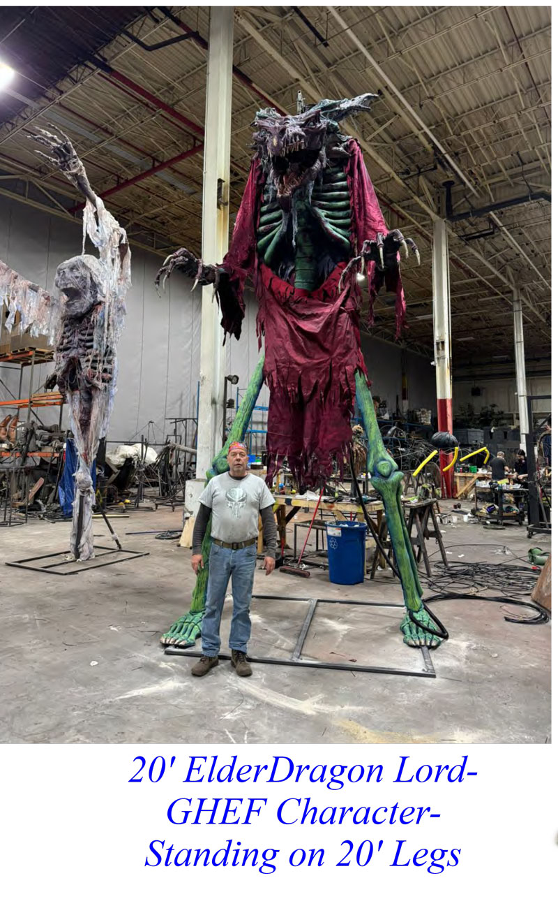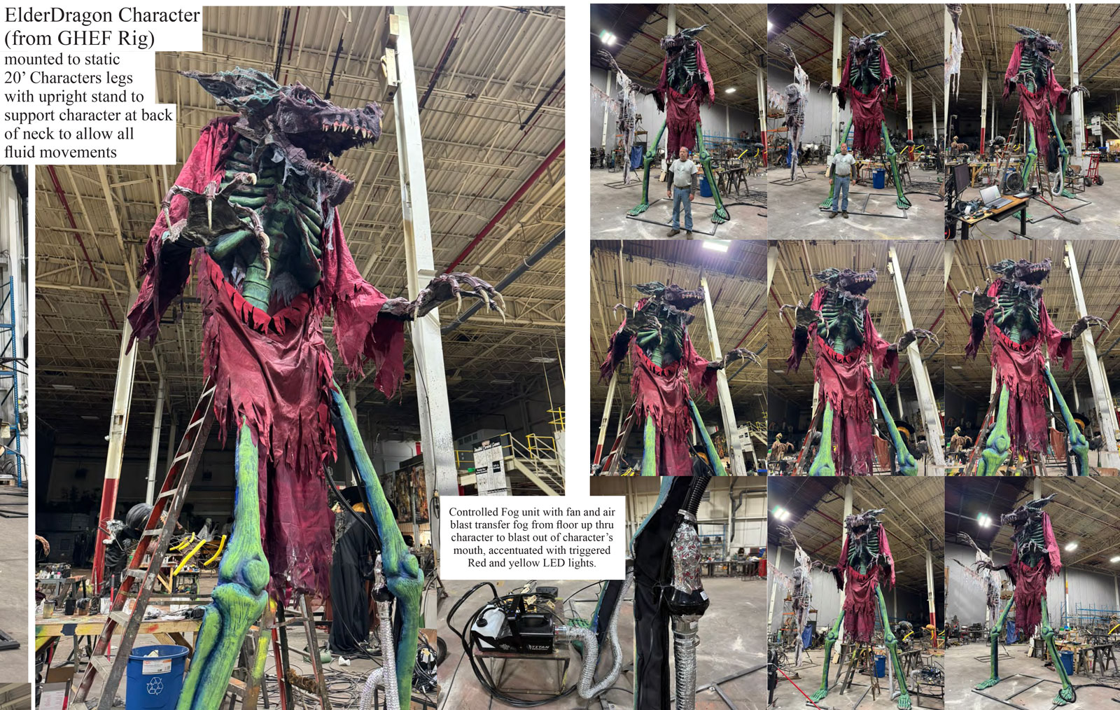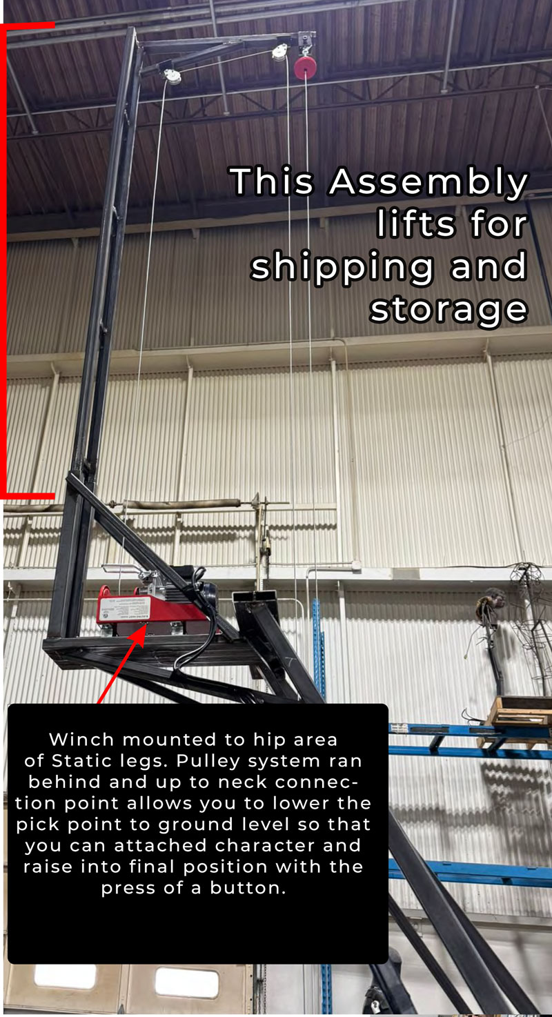 20’Character (from GHEF Rig) mounted to static 20’ Characters legs with upright stand to support character at back of neck to allow all uid movements. This new rig allows all of the incredible character attributes of our 20’ characters to be utilized in a much smaller 6’ x 7’ footprint. The characters stand at 20’ and feature jaw, head and independent arm movements that allow the character to freely articulate as it oats from the hidden pivot mount at the rear of its neck. Character is easily loaded on top of the Leg stand via the optional electric winch system.