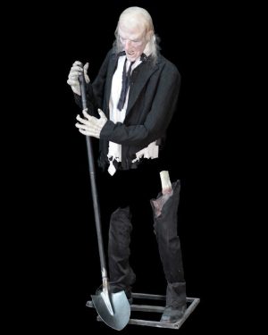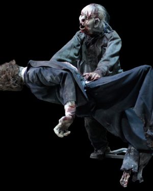Zombie behind wall peaks over cabinet opening through broken away lathwork. When activated, Zombie lunges up/through opening, tilting cabinet forward.